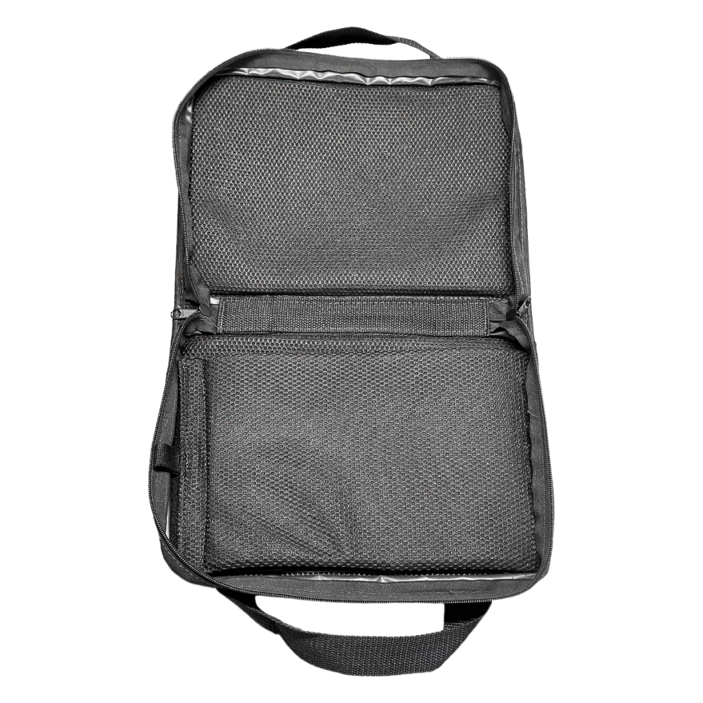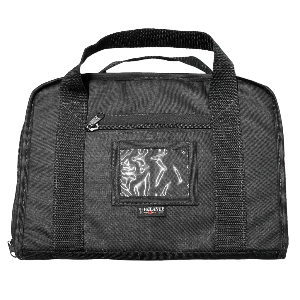 Bolsa dupla confeccionada em nylon (preto) para armazenamento de revólver e munições.
