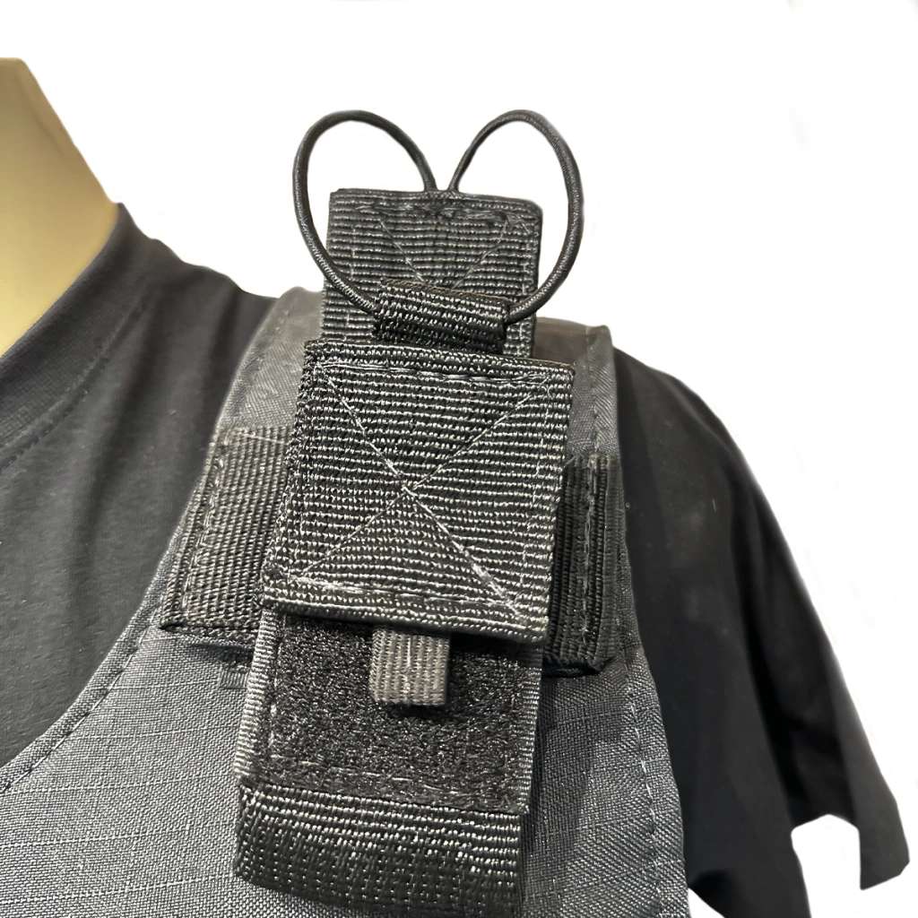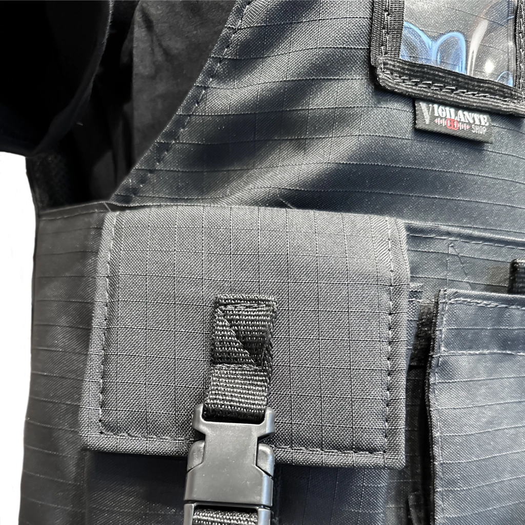 Capa ostensiva com velcro e fechamento com abas e fecho de segurança 25MM; velcro para logo frontal (peito esquerdo) e velcro para logo (dorsal). Tecido: Rip Stop. Possui 6 acessórios: porta rádio (ombro esquerdo); porta crachá (peito direito); porta munição 6T; bolso 11,5x15 com fole e fecho (aba direita); coldre 6T; e porta celular (aba esquerda). Com tecido interno aerado (permitindo maior conforto).