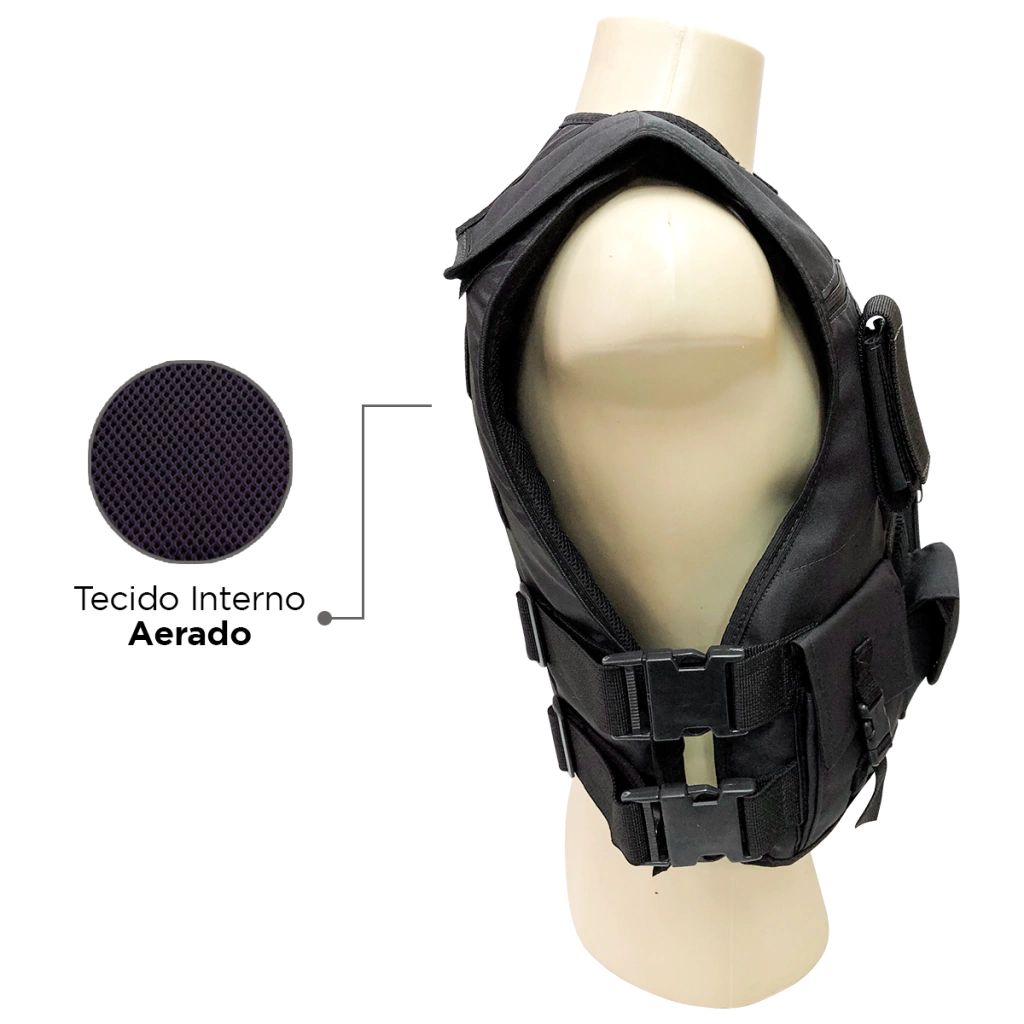 DESCRIÇÃO DO PRODUTO: - Tecido externo 100% poliéster resinado de alta resistência na cor preta. - Tecido interno spaincer (permitindo maior conforto). - Porta rádio HT. - Porta celular. - Porta crachá. - 2 bolsos embutidos com ziper. - 1 bolsos grandes lado direito. - Porta munição 6t - Porta algema. - Porta caneta. - Velcro frontal para logo. - Velcro dorsal para logo. - Abertura para painel balístico. - Coldre universal velado com abertura em zíper.