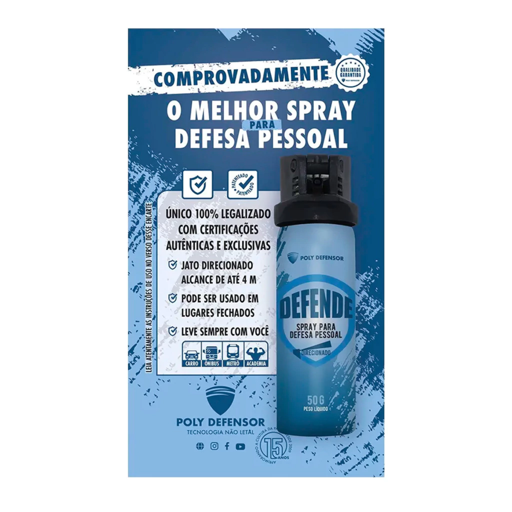 Spray para defesa pessoal - Uso civil autorizado pelo Exército Brasileiro. Objetivo: Desmobilizar o agressor para se evadir do local e/ou chamar a Autoridade Policial. Conteúdo: Extratos vegetais, óleos essenciais, água e propelente não inflamável. Ação: Sensação de asfixia, ardência ocular e pele. Informações gerais: Possui dispositivo de proteção contra disparos acidentais FLIP-TOP Dispersão em Aerosol, com jato em formato de cone Alcance de 2,5m Não inflamável Inovensivo à camada de ozônio Antídoto: àgua Rendimento aproximado: 18 aplicações de um segundo cada Dimensões: Ø 35mm x (a) 12,2cm Peso Líquido 50g e Peso Bruto 82g Garantia de 5 anos